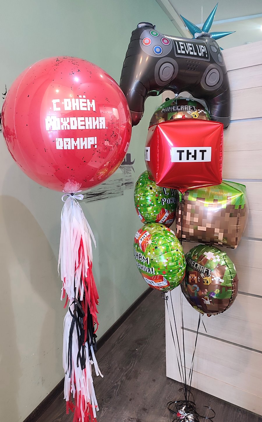 - гелиевый фонтан из 7 фольгированных шаров ( 4 фольгированных круга Майнкрафт, 2 куба из фольги, 1 фигура Джойстик)